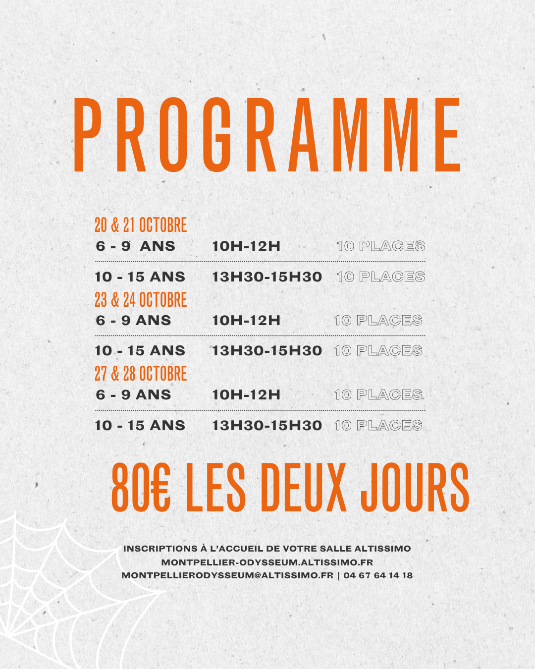 Pendant les vacances d’octobre, votre salle d'escalade, Altissimo Montpellier Odysseum, propose des stages ludiques et sportifs spécialement adaptés aux jeunes de 6 à 15 ans.